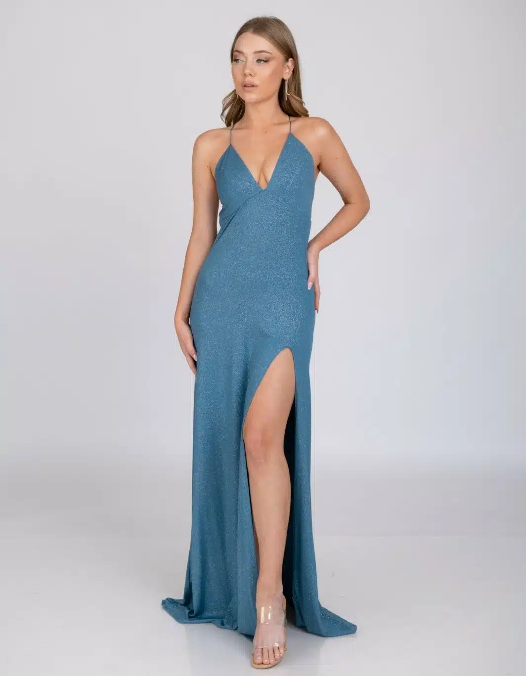 שמלת ערב מקסי 2 קטפיות ושסע ללוק נוצץ וקלאסי