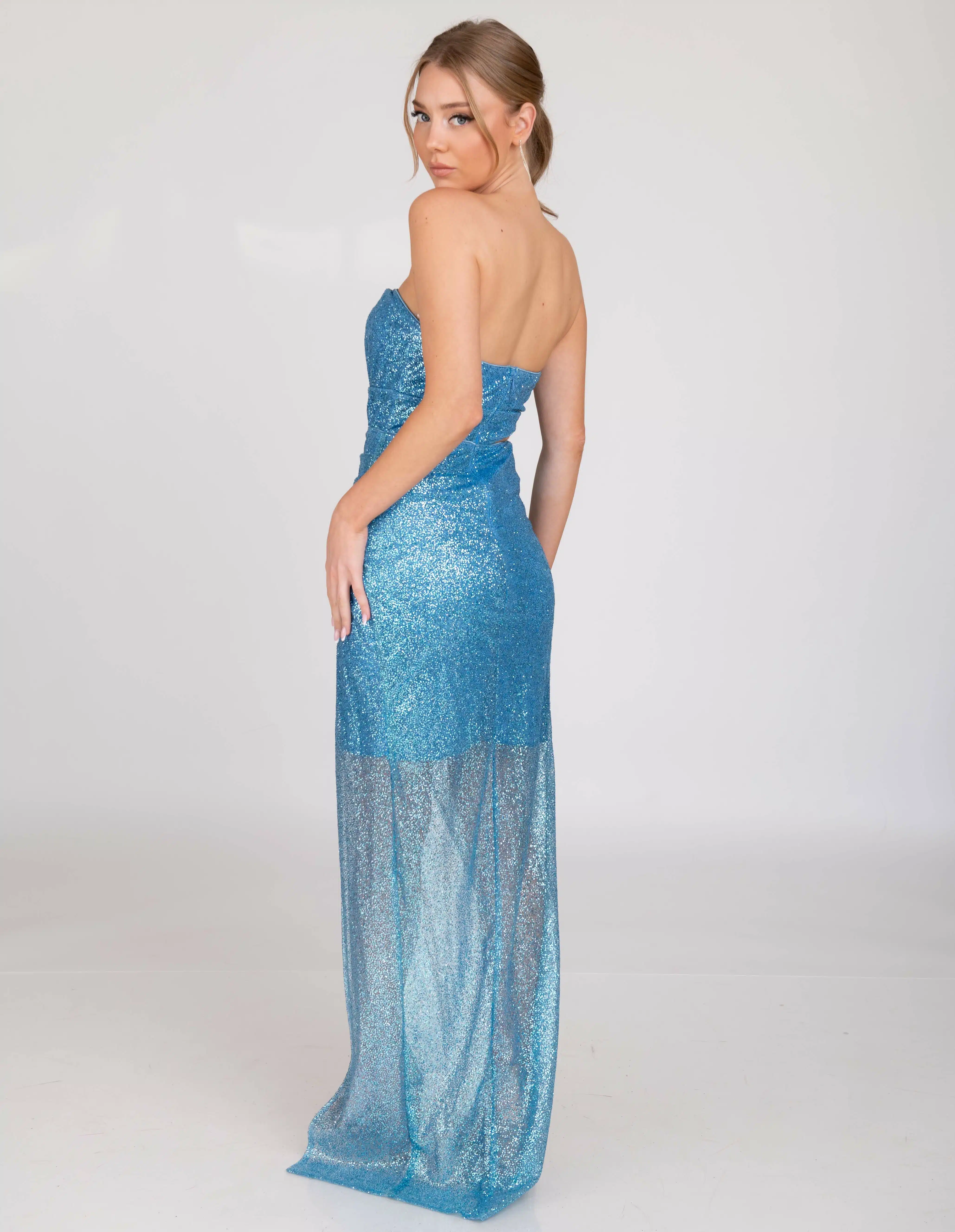שמלת ערב סטרפלס מבד רשת נצנצים עם גב חצי פתוח, שסע ופתח בצד הבטן