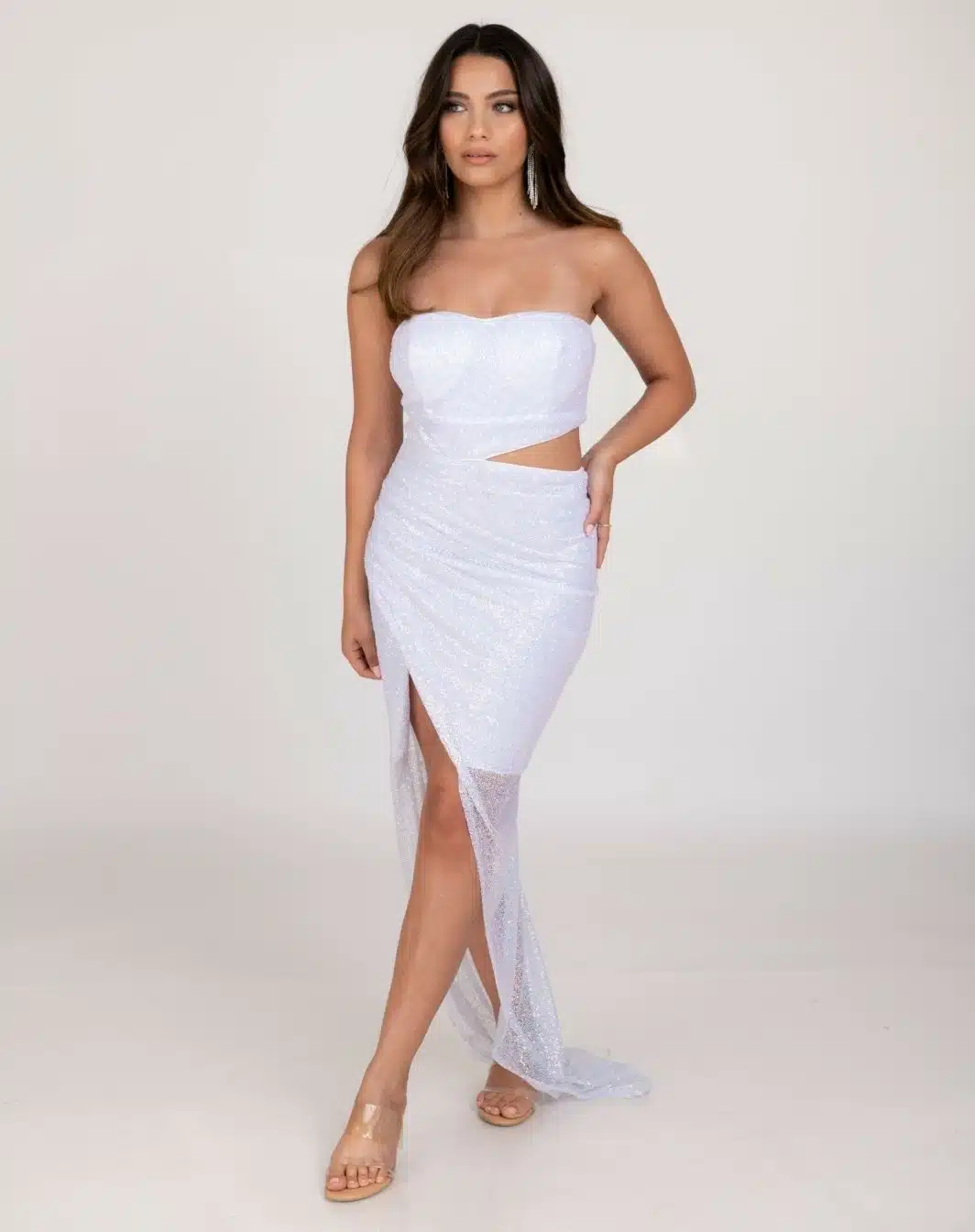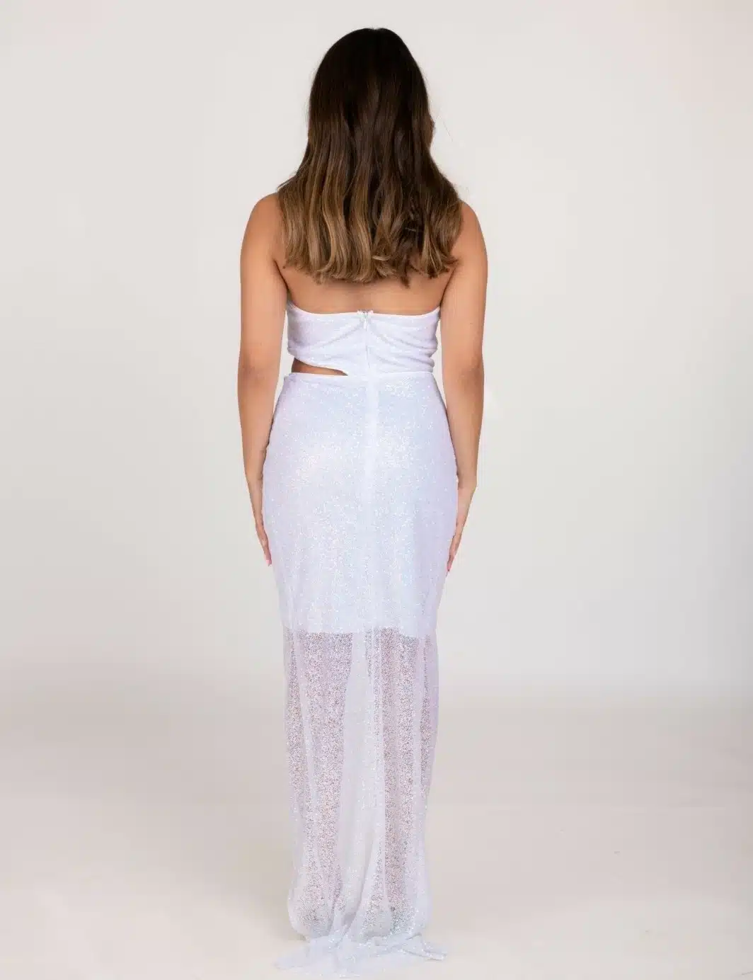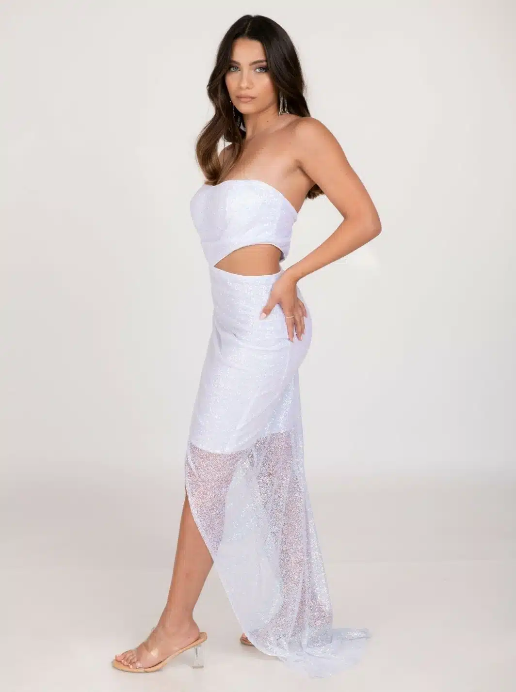 שמלת ערב סטרפלס מבד רשת נצנצים עם גב חצי פתוח, שסע ופתח בצד הבטן
