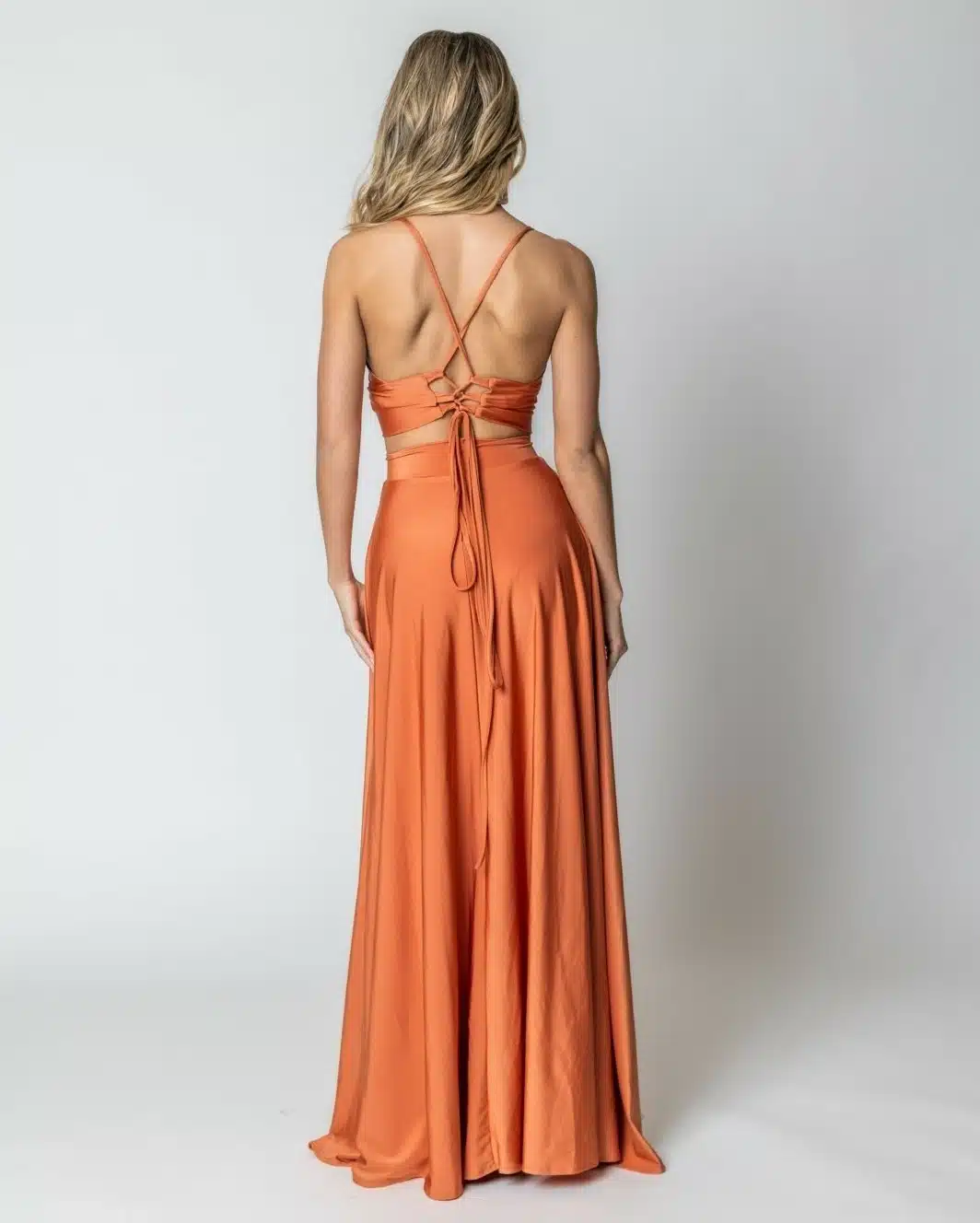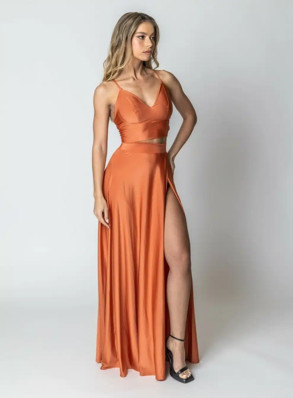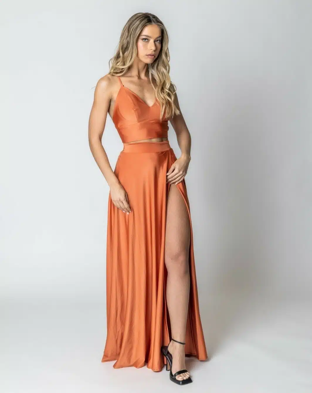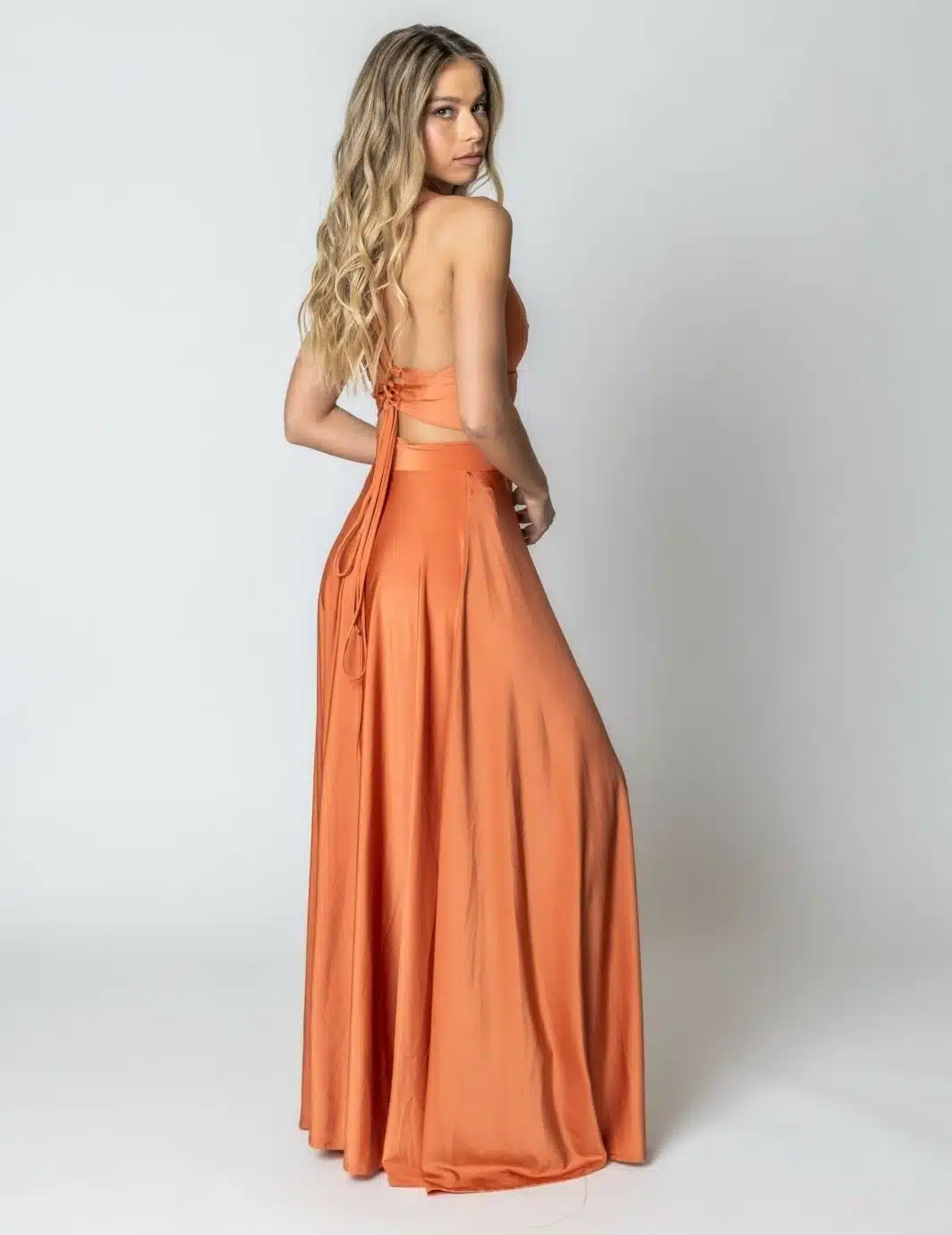 שמלת ערב מקסי מבד סטאן 2 חלקים עם שסע וגב פתוח לוק מושלם לאירוע שלך