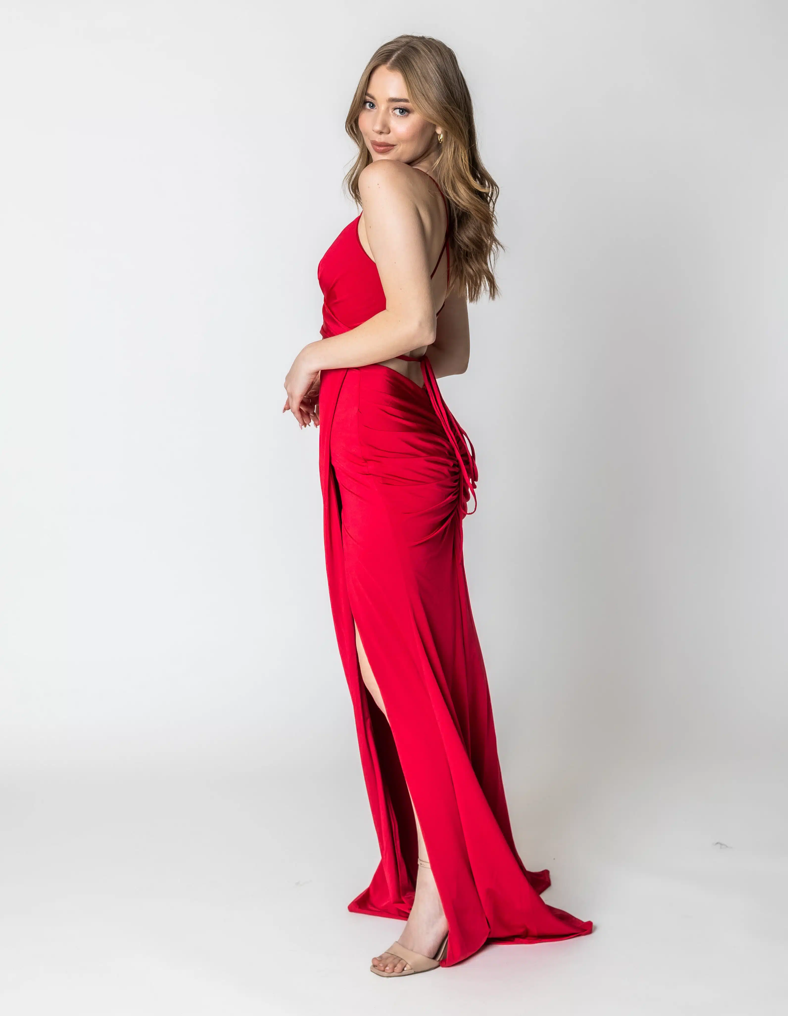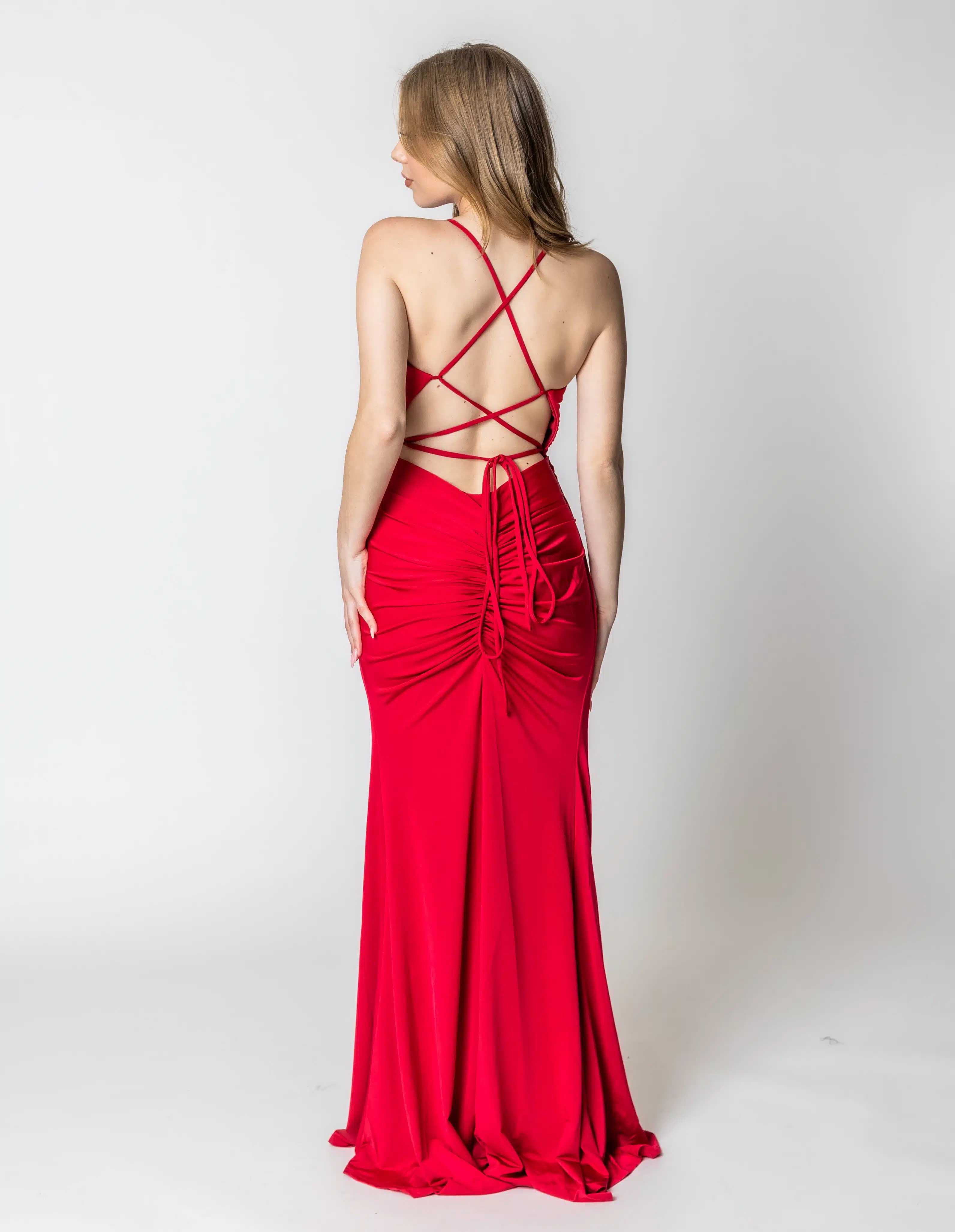 שמלת מקסי גב פתוח עם שסע וכיווץ בישבן