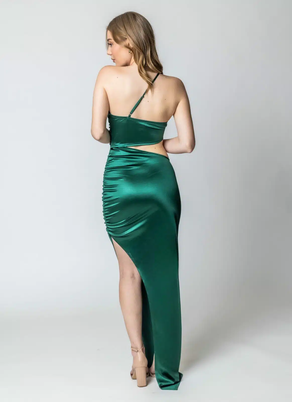 שמלת מקסי ירוקה עם כתף אחת, עשויה בד סאטן עם פתח בבטן ללוק מושלם לאירוע שלך