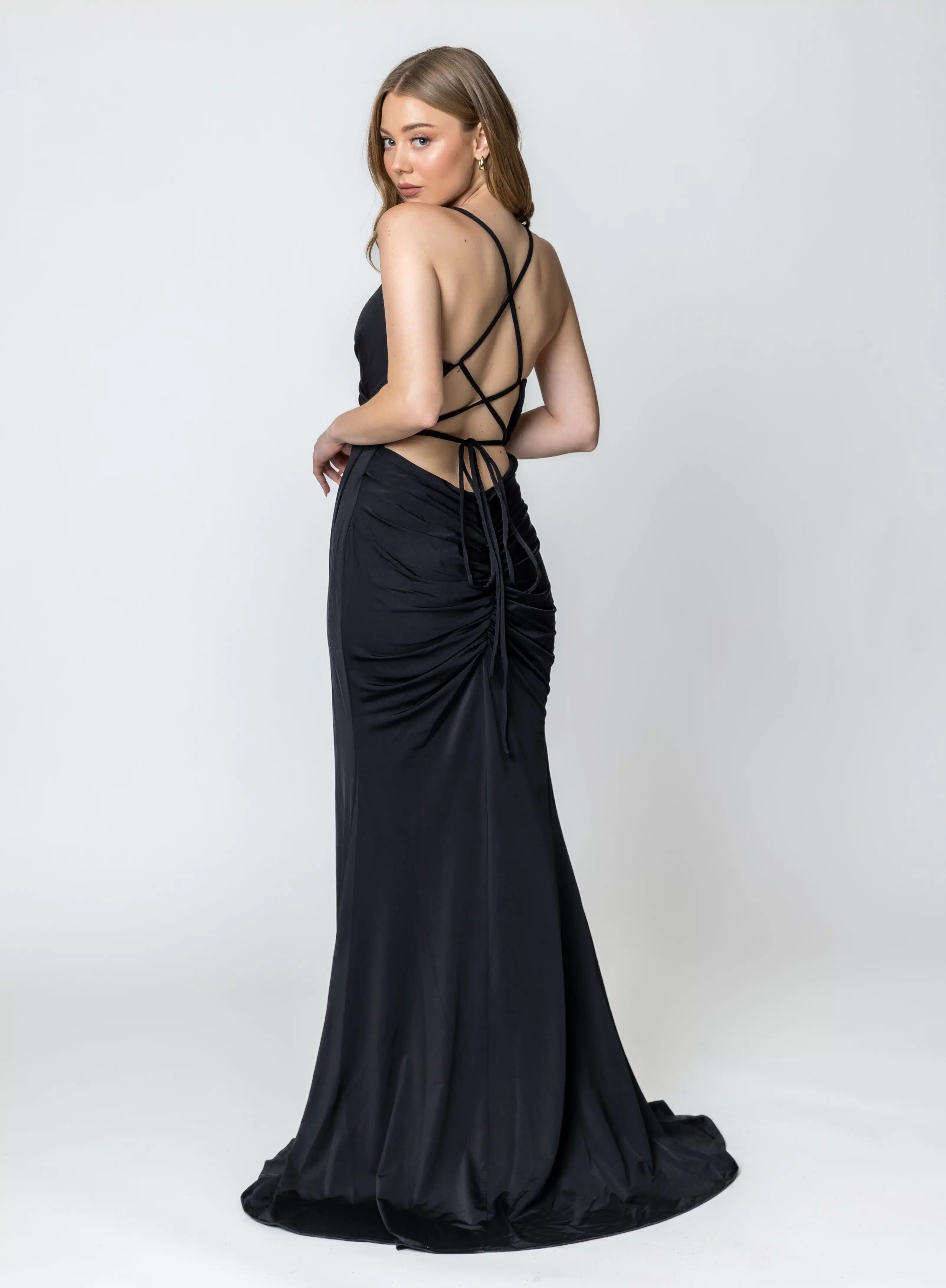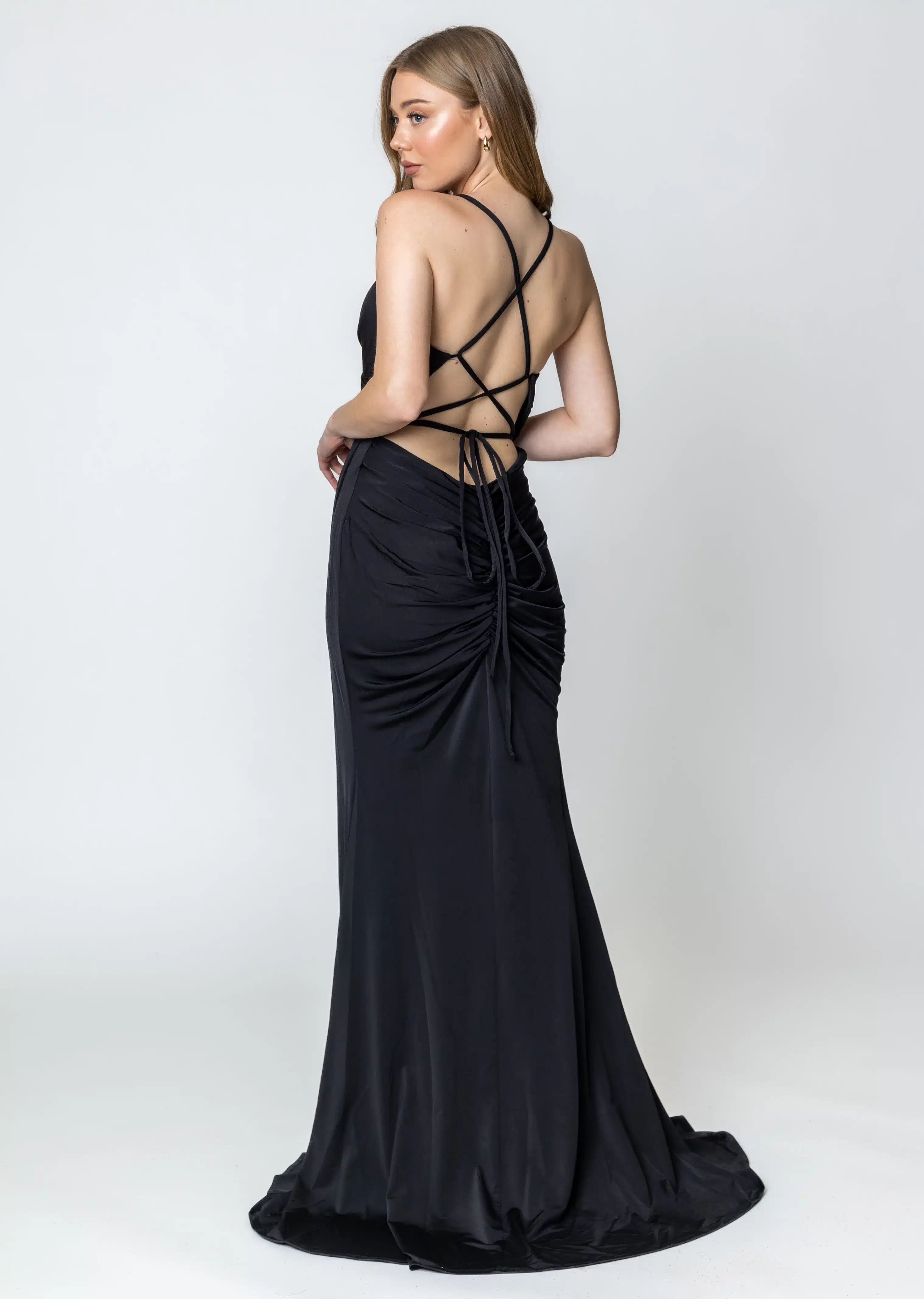 שמלת מקסי עם גב קשרים פתוח ושסע כיווץ בישבן